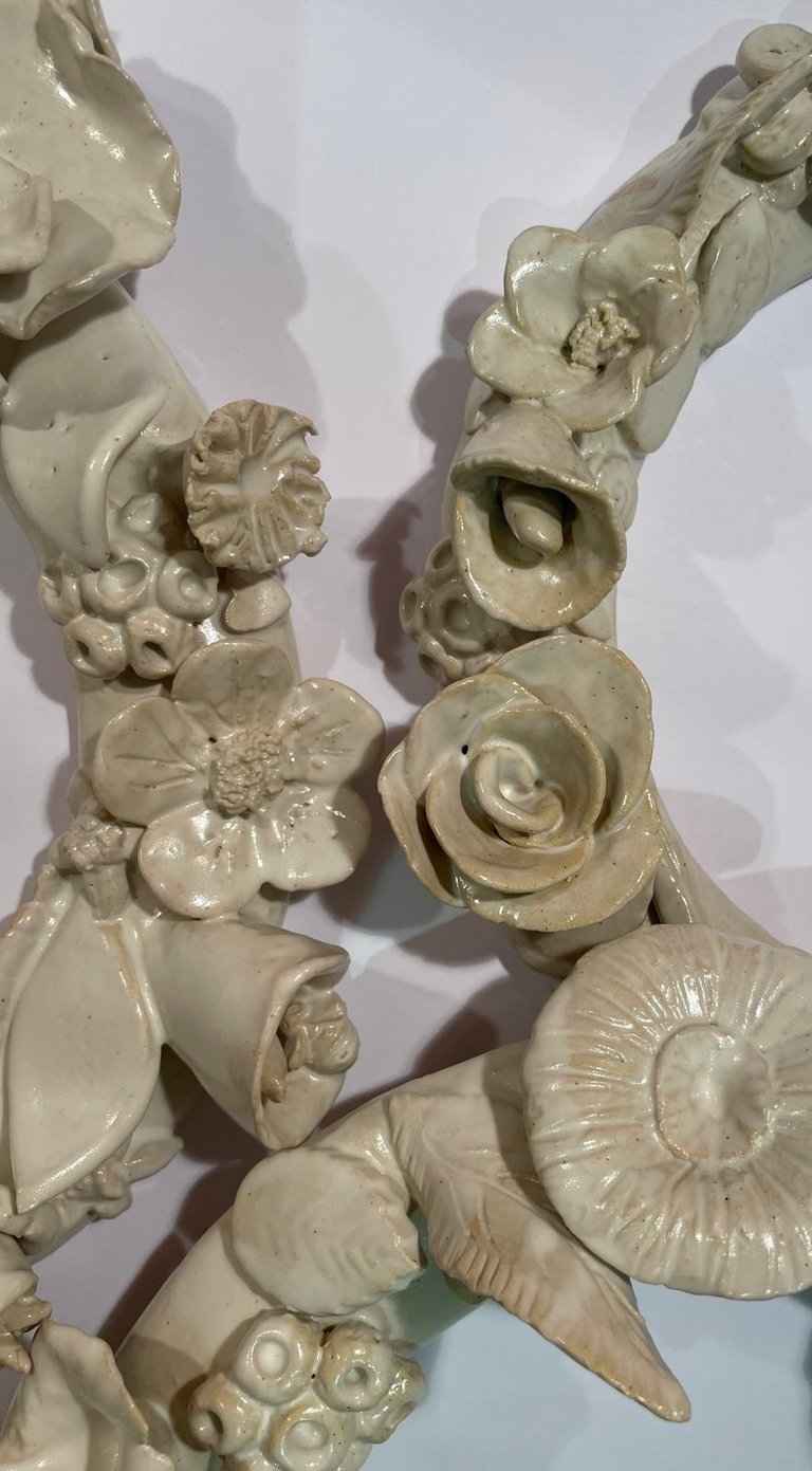 Lately I have been helping make ceramic wedding flower arrangements. We have had several wonderful creative sessions with 4 or 5 people making flowers out of white stoneware which I have then attached to rounded bases to show them off to best effect. We have experimented with roses, convolvulus, ivy berries, leaves and some completely imaginary shapes. They have been finished with white slip and white matt glaze. i am looking forward to the next session in which will investigate name places and table numbers. I feel honoured to be involved in this lovely project.